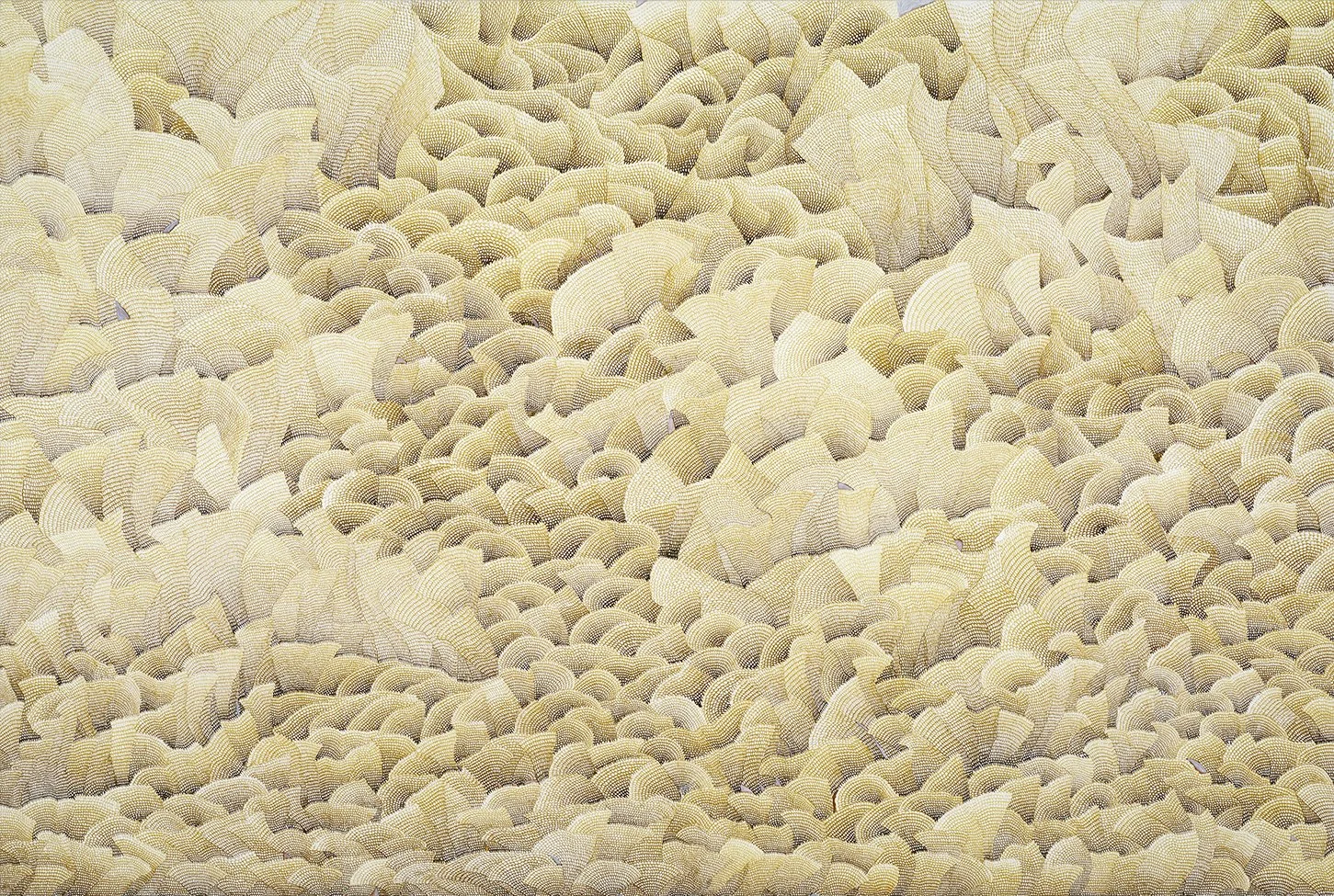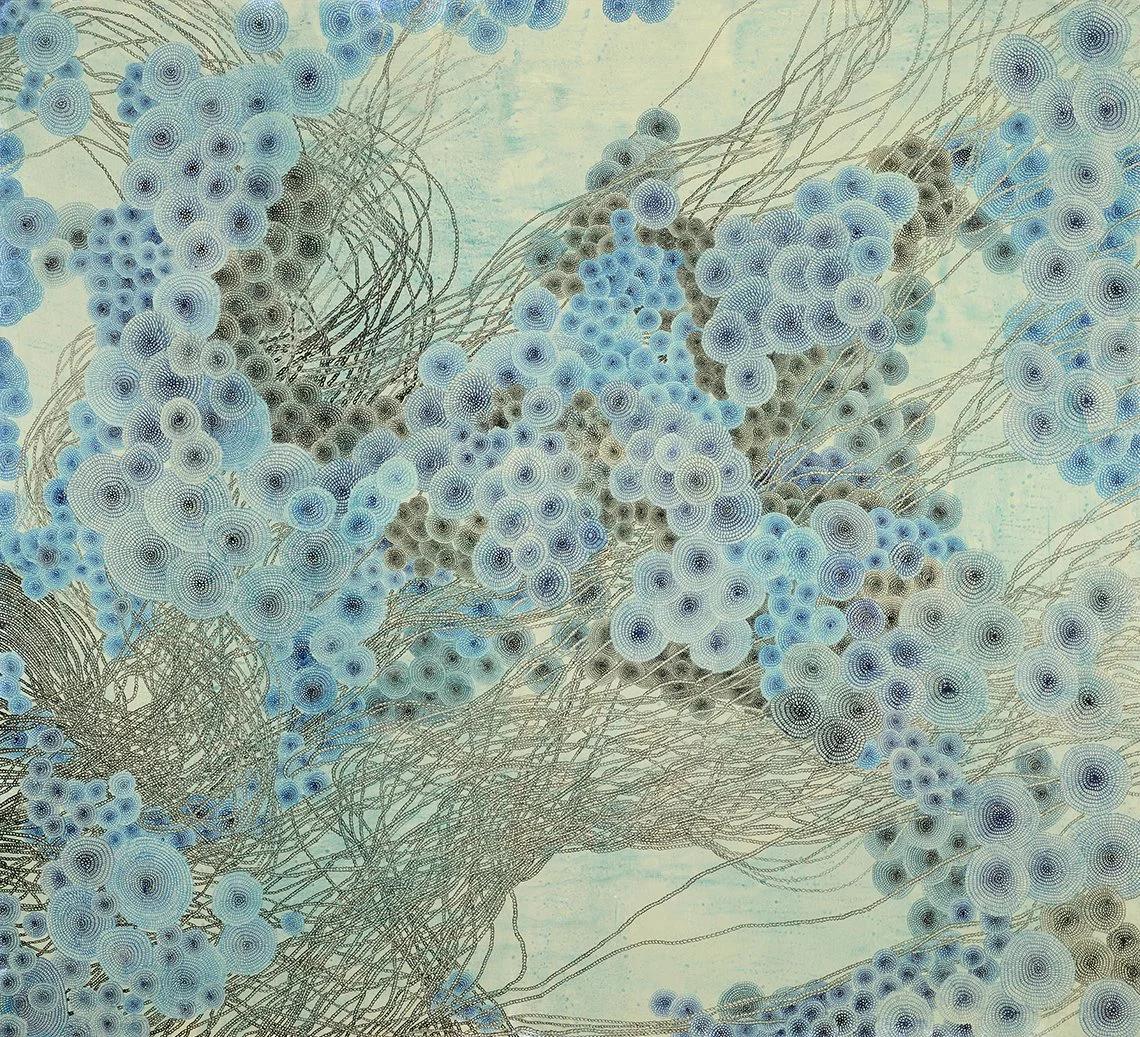 Hala Schoukair offers a vibrant framework of organic shapes, as long explored in traditional Middle Eastern art. She expands, revisits, and deepens this theme through the infinite repetition of a single motif, which has an unsettling effect on us about the painterly or organic nature of the picture plane. Her timeless approach differentiates her art from her mother's more modernistic universe. Each painting, with its unique shapes, colors and sensations, emerges from a very sensitive and elaborate effort with great depth. A fascinating structural system can be discerned that is based on a given work’s motif. As well as a proportional relationship between the infinitely small and the infinitely vast, an aspect akin to the search for golden ratios and perfect proportions. The structure and intensity of her art makes it oscillate between abstraction and figuration. This is our artist's great artistic innovation: Halal Schoukair offers, through simple formal experimentations, a cosmological reflection on our nature and the nature of the world with great aesthetic ambition!