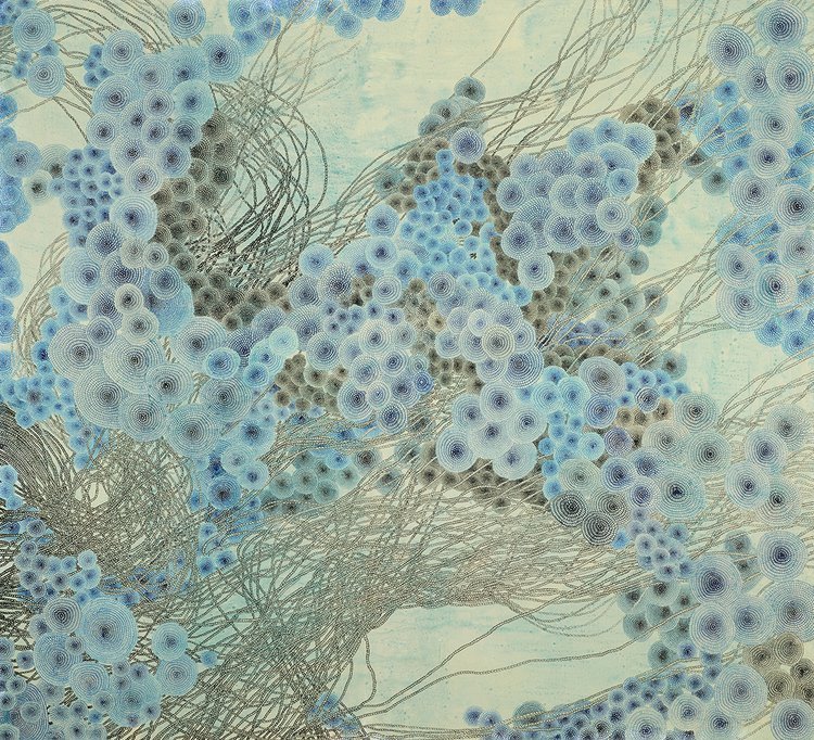 Schoukair’s enticing art often expresses itself with one colour, echoing out in multiple shades, and cocooning within her floral motifs and repetitive brushstrokes, powerful messages evoked in a gentle and sensitive manner.