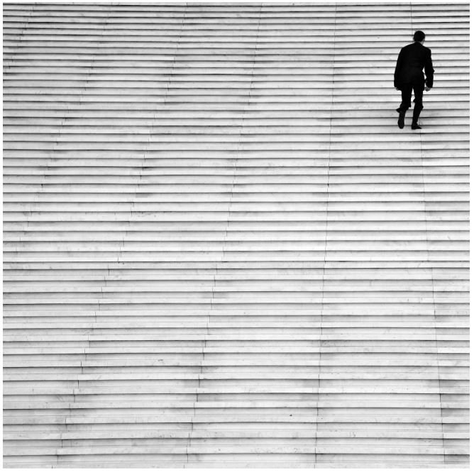 My first one, called Road to Power, was a picture I had taken at La Défense in Paris: a working man climbing the stairs. It is a square image and the man is situated on the upper right side of the picture instead of being the main subject. This choice raised my interest to focus on lines whilst using a man to add scale to a picture. It became a challenge where geometry and figures interact in interesting ways.